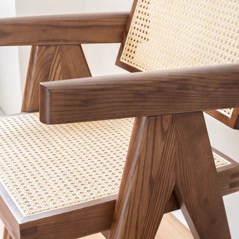 本商品の最大の特徴は、木の質感を活かしたフレームデザインと、ラタンの軽やかさを組み合わせたバランスの良さにあります。 ウッドフレームには、温かみのある木目が美しいタモ材やチェリーウッドを採用。天然木ならではの自然な表情は、一脚として同じものが存在しない特別感を持ちます。さらに、直線と斜めのラインを組み合わせた独自のシルエットは、シンプルながらインテリアのアクセントにぴったり。 アームレストの直線的なデザインは、視覚的な安定感をもたらすと同時に、空間にモダンな雰囲気をプラスします。ナチュラルインテリアはもちろん、北欧テイスト、和モダン、さらにはヴィンテージスタイルとも相性が良く、コーディネートの幅を広げます。